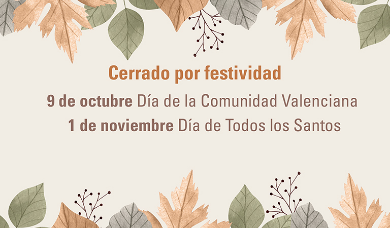 Desde Agencia Comercial Mondragón os recordamos que la empresa permanecerá cerrada por festividad el día 9 de Octubre (Día de la Comunidad Valenciana) y 1 de Noviembre (Día de todos los Santos).