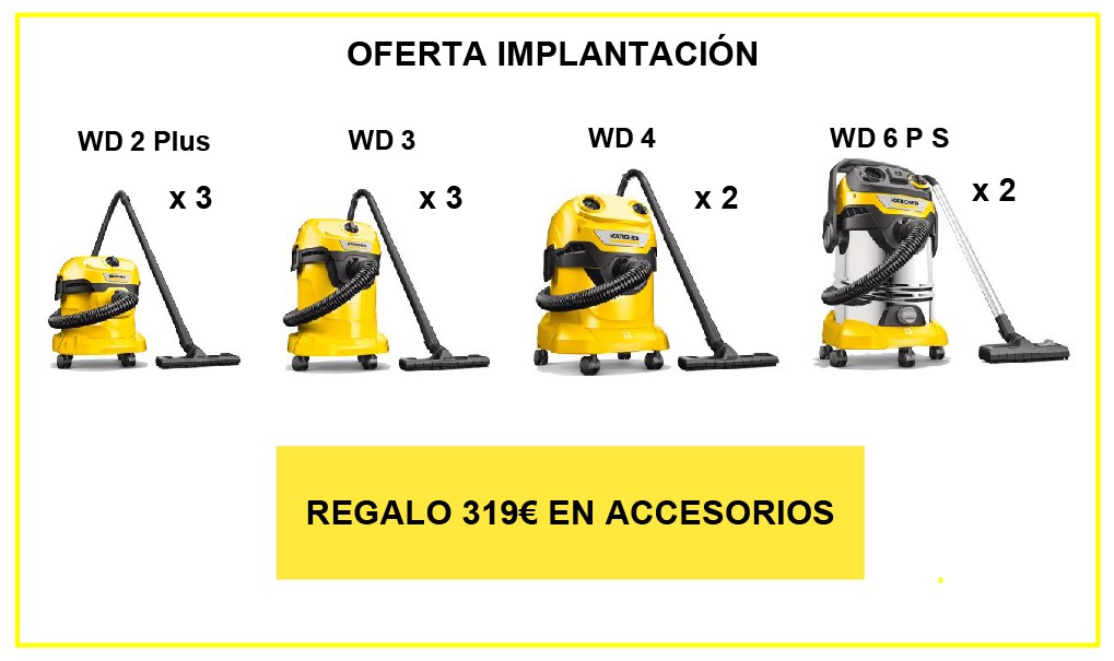 | Ahora, por la compra de 10 aspiradoras de la gama WD, llévate 319 € en accesorios para personalizar el equipo de limpieza a la medida. Aspiradoras con máxima potencia de succión, función de soplado y capacidad para eliminar suciedad sólida y líquida, ideales para una limpieza impecable en todo el hogar. |